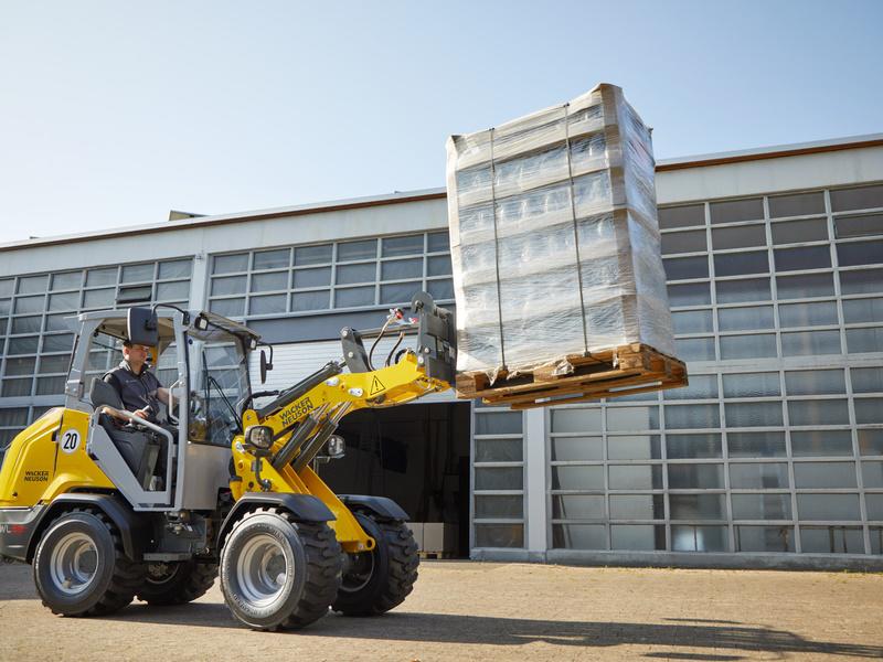 Transporting heavy loads through tight spaces is the ideal operational area for the WL28 wheel loader. It can easily handle pallets of paving stones or other material up to 1.6 metric tons. The electronically-controlled travel drive with various travel modes enables extremely productive work using the machine. The low-designed cab ensures excellent visibility and high tipping loads. Because of the outstanding visibility, the machine offers exceptional safety during operation. The low operating weight also allows the WL28 to be transported on a car trailer.
